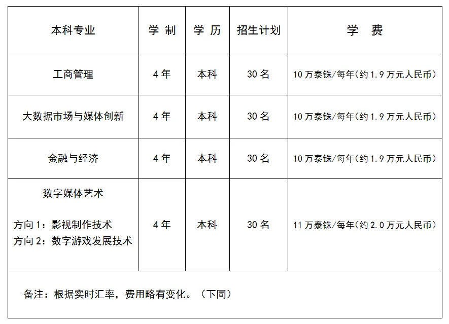 学制与学位:学制四年,毕业后由泰国坦亚武里皇家理工大学颁发学士学位。