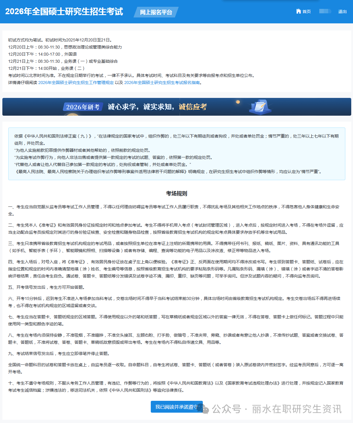 进入研招网报平台首页后,你将看到初试时间提醒、考场规则等内容,这个页面上的提示要认真阅读!